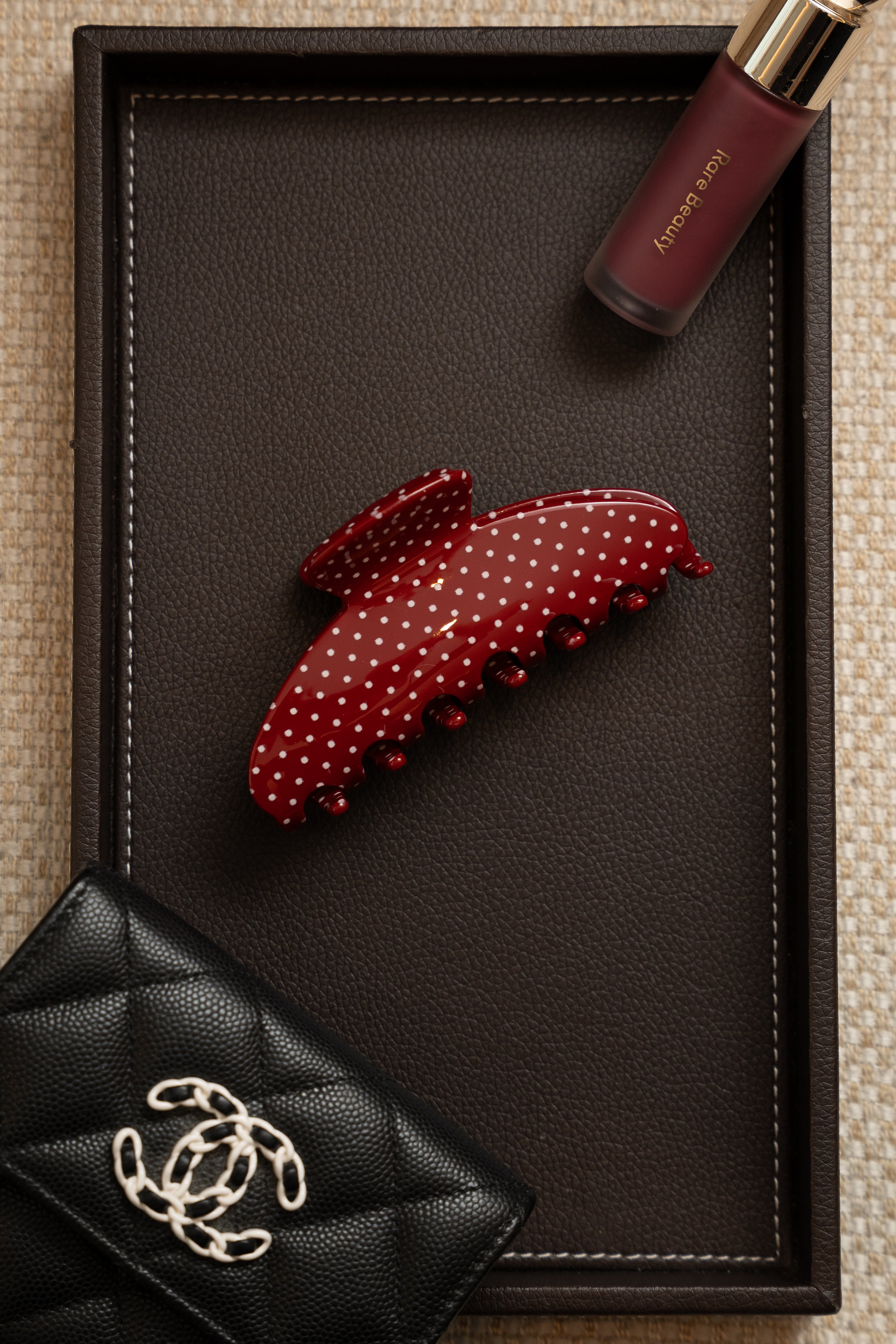 Meet your new spot-on favorite. The Polka Dot Hair Claw adds a pop of fun to any hairstyle with its retro-chic print and sturdy grip. Perfect for messy buns, half-ups, or just clipping back your hair while you sip your iced latte — it’s cute, cheeky, and effortlessly playful.